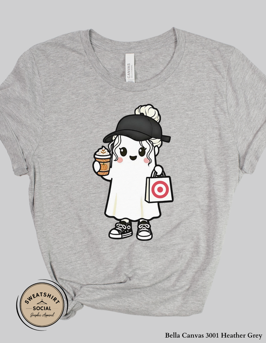 Adult Shopping Ghost Halloween Shirt – Pumpkin Spice Coffee & Target Run Tee (Unisex S–2XL)