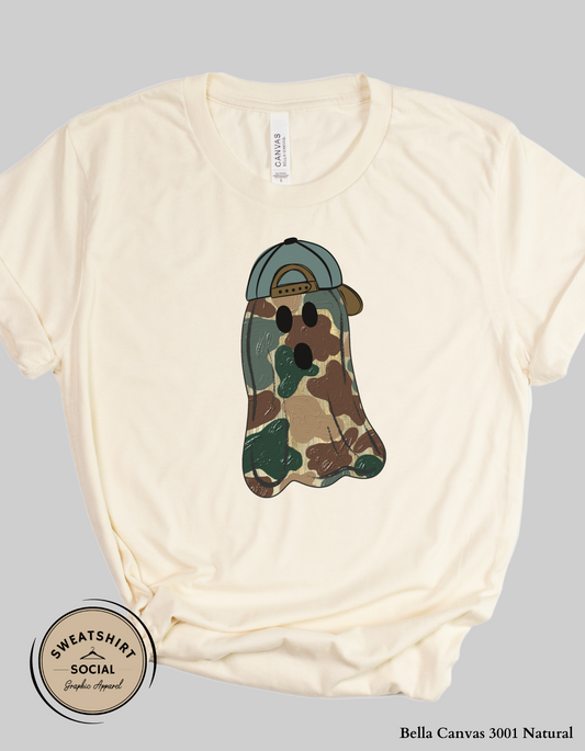 Adult Camo Ghost Halloween Shirt – Spooky Cute Tee with Hat (Unisex S–2XL)