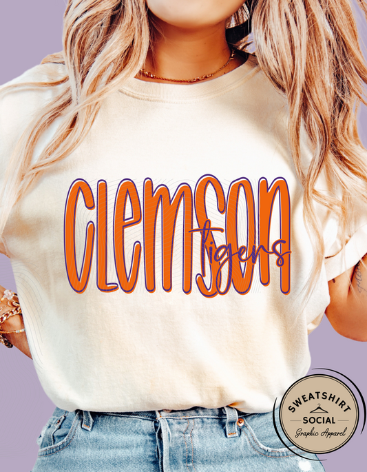 Clemson Tigers Lettered Look Tee or Sweatshirt – Orange & Purple (Adult Sizes)
