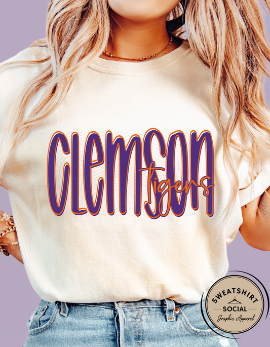 Clemson Tigers Lettered Look Tee or Sweatshirt – Purple & Orange (Adult Sizes)