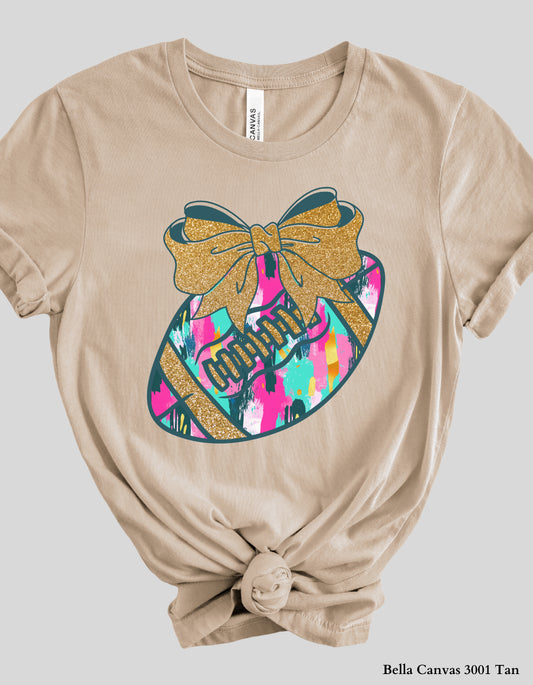 Colorful Game Day Football Shirt with Bow – Faux Glitter Design (Adult Tee or Sweatshirt for Football Moms & Fans)
