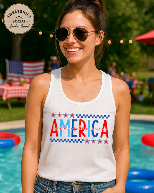 America – Land of the Free Shirt or Tank (Adult Sizes) | Patriotic Red, White & Blue Tee