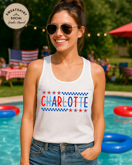 Charlotte NC Fourth of July Shirt – Patriotic Red, White & Blue Hometown T-Shirt