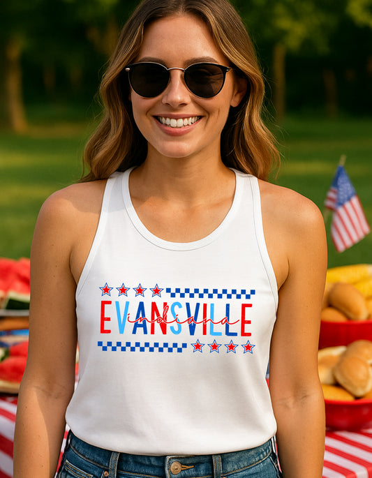 Evansville IN Fourth of July Shirt – Patriotic Red, White & Blue Hometown T-Shirt or Tank