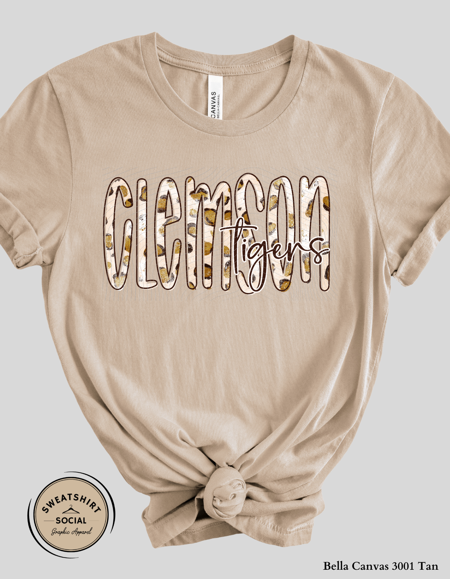 • Trendy cheetah-print “Clemson Tigers” lettering
